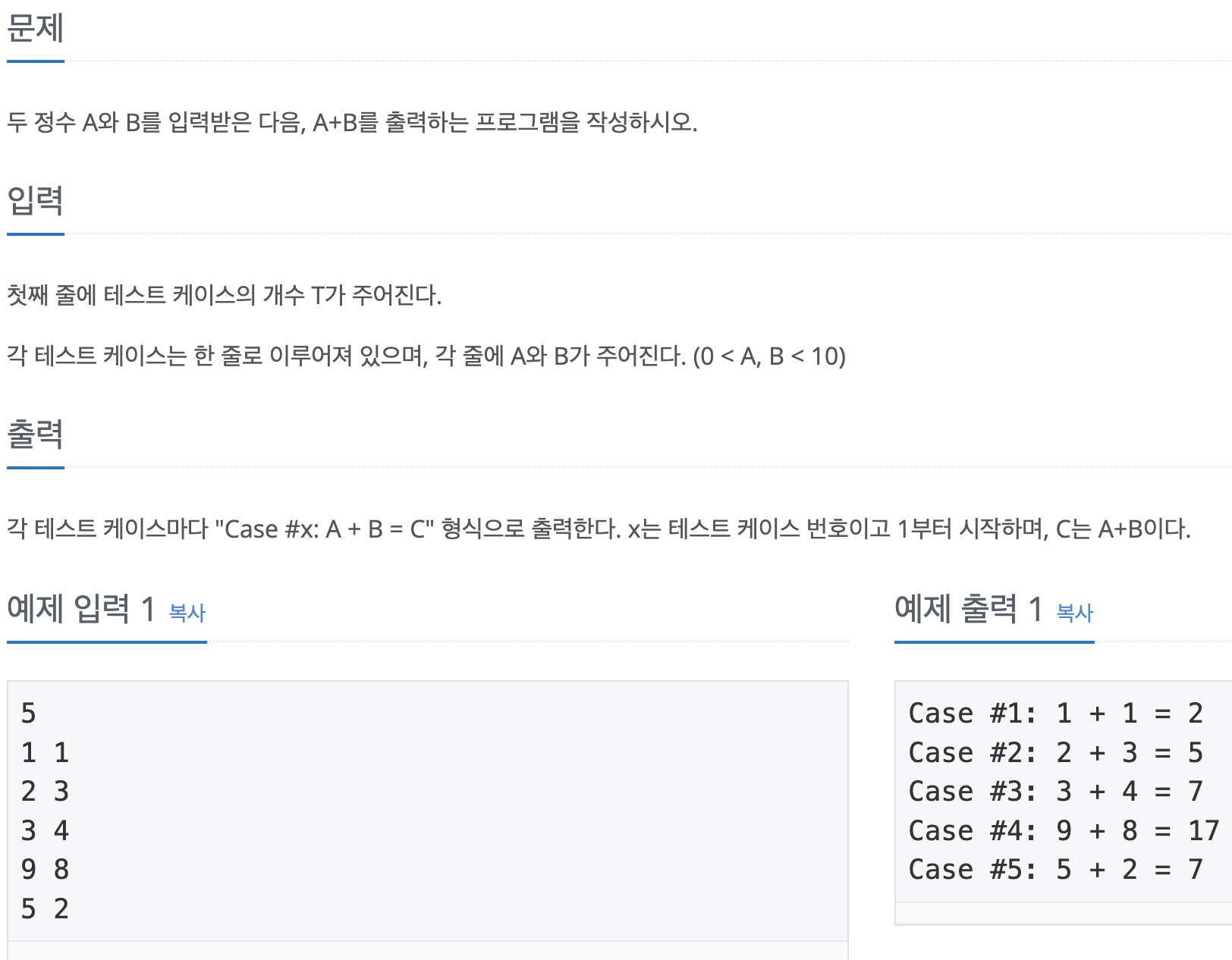 각 테스트 케이스마다 "Case #x: A + B = C" 형식으로 출력한다. x는 테스트 케이스 번호이고 1부터 시작하며, C는 A+B이다.